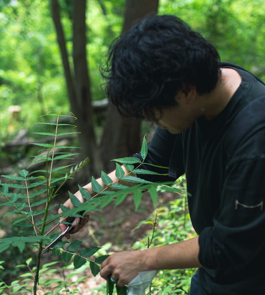 単純に必要な人数分を採取するのではなく、生育状況や日のあたり具合のような植物の周辺環境も考慮しながら、長く伸びた枝を剪定するように、生育に大きな影響が出ないように配慮しながらの作業だという。人間の都合に合わせて素材を調達するのではなく、環境が豊かに保たれていくことに気を配りながら自然の恵みをいただく、そういった姿勢を大切にしているそうです。