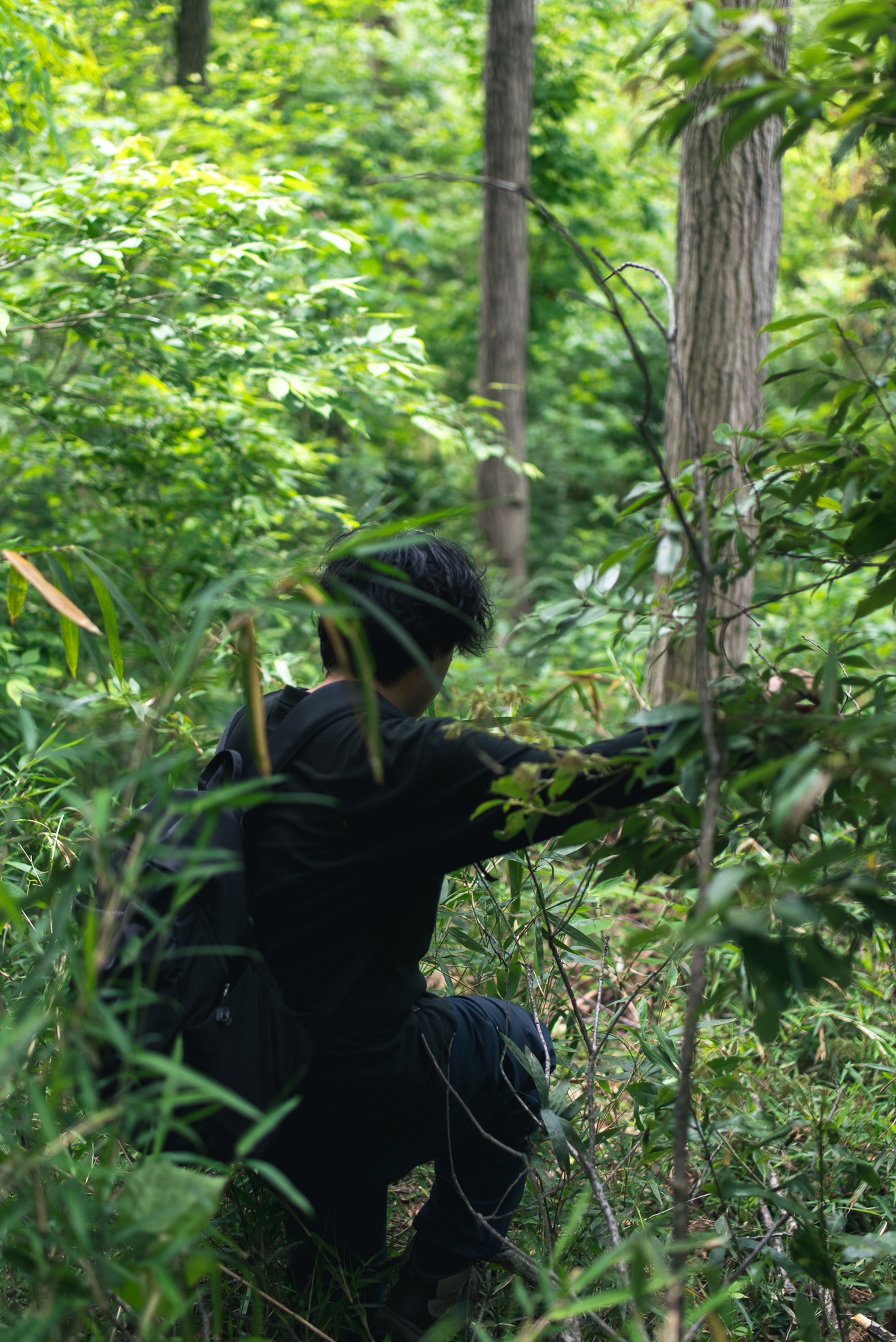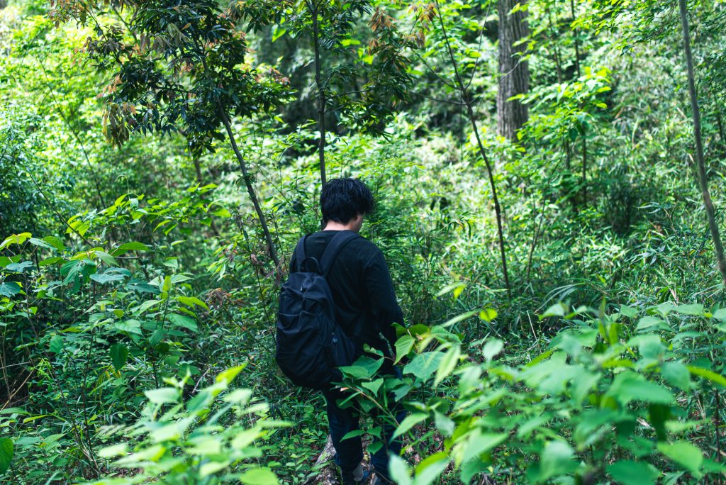 足元に気をつけながら、藪の中を歩いていくことも。笹をかき分けながら斜面を下っていく場面もあり、先を行く山口さんの進んだところなぞるように進んできました。