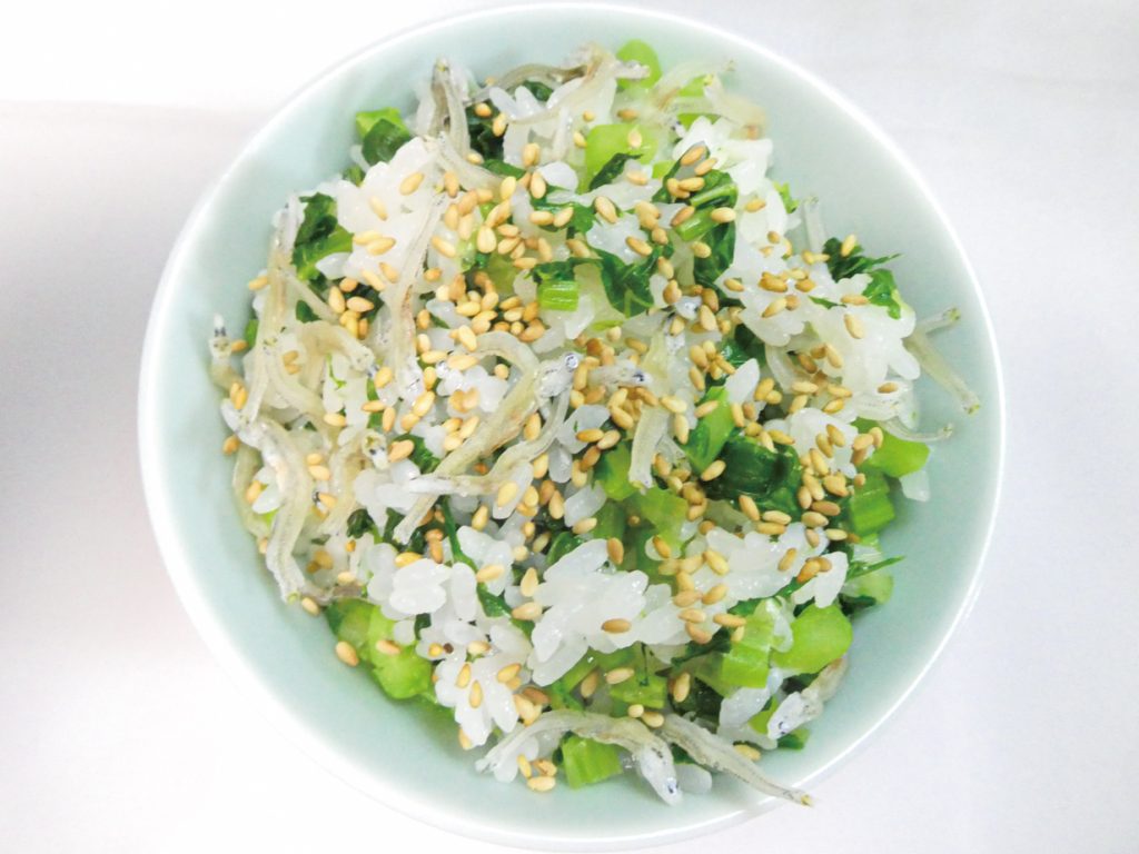 - 味がなじんだらのらぼう菜をよく絞って、ちりめんじゃこと一緒に温かいご飯と混ぜ合わせる。